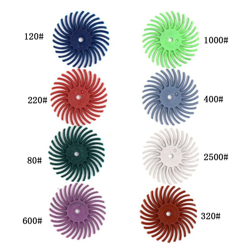 快速,径向刷毛圆盘快速,卓越的结果!它们独特的三维磨料/柔性刷毛设计提供了统一的饰面。用它们进行重型清洁,用于去除火柱和光氧化物,以及预抛光,半精加工,混合,纹理和抛光。光盘提供预充电磨料的便利性,但不产生与橡胶轮相关的热量。